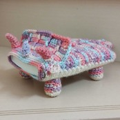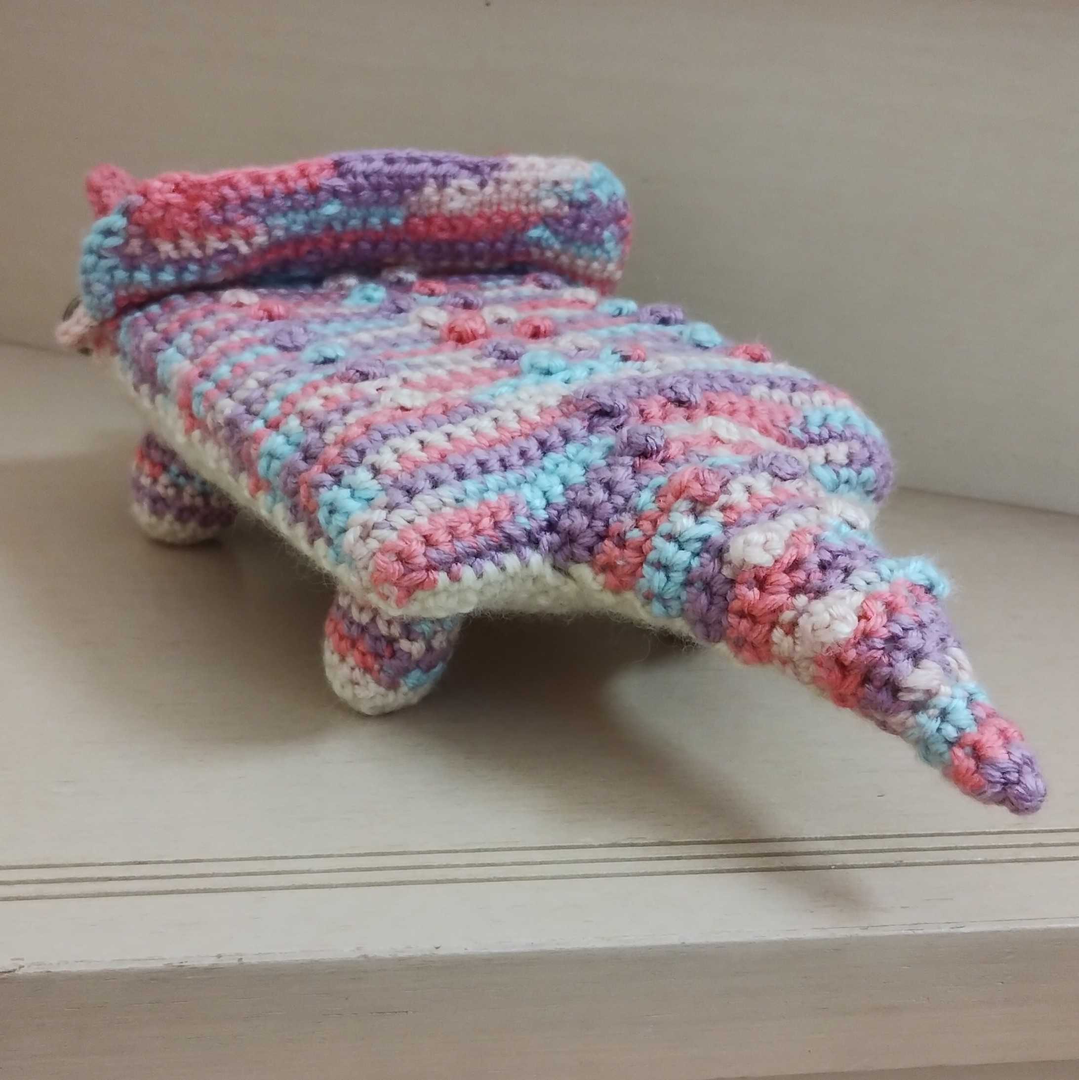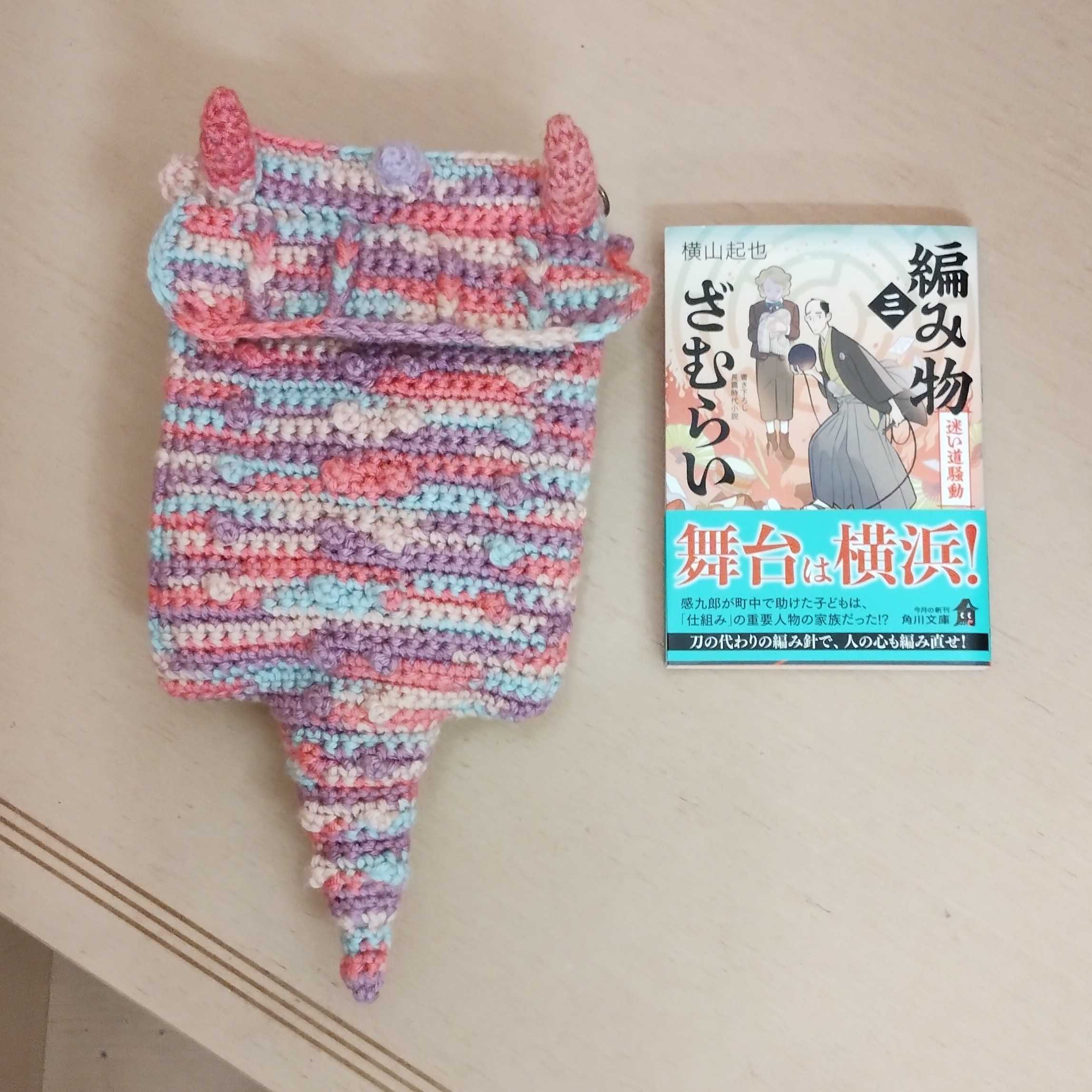トリケラトプスと融合した文庫ぬい。フリルと角が自慢です。内側は薄い紫。
